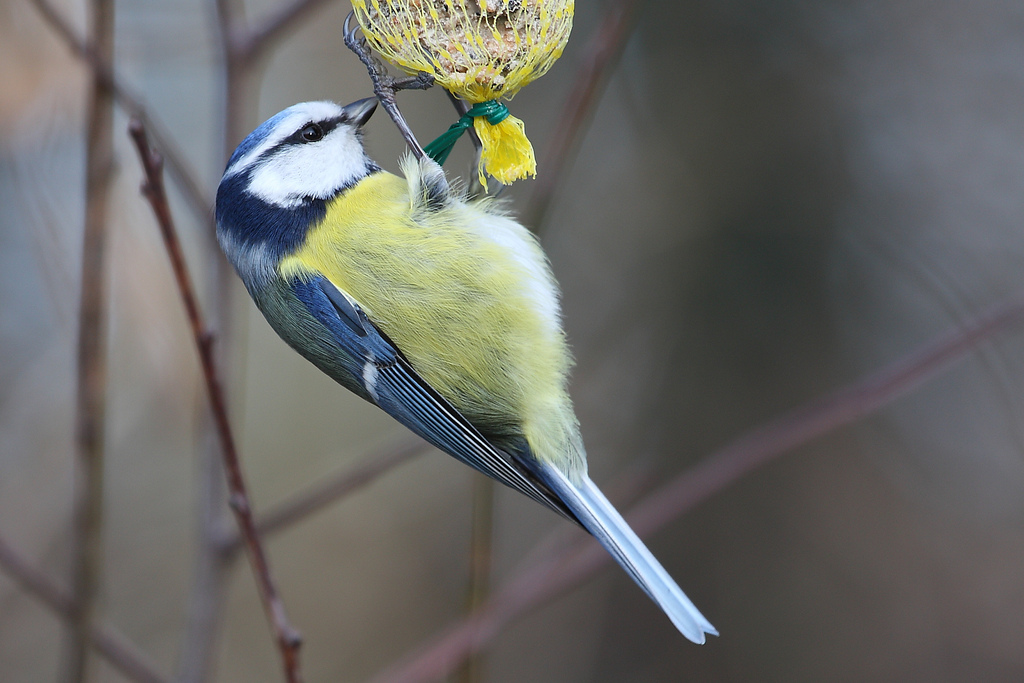Je suis aussi une mésange mais je suis nettement plus petite et je n’ai pas de noir sur la tête, je suis la mésange bleue. Je suis l’acrobate du jardin et tu me verras souvent suspendue la tête en bas pour atteindre une graine particulièrement succulente.